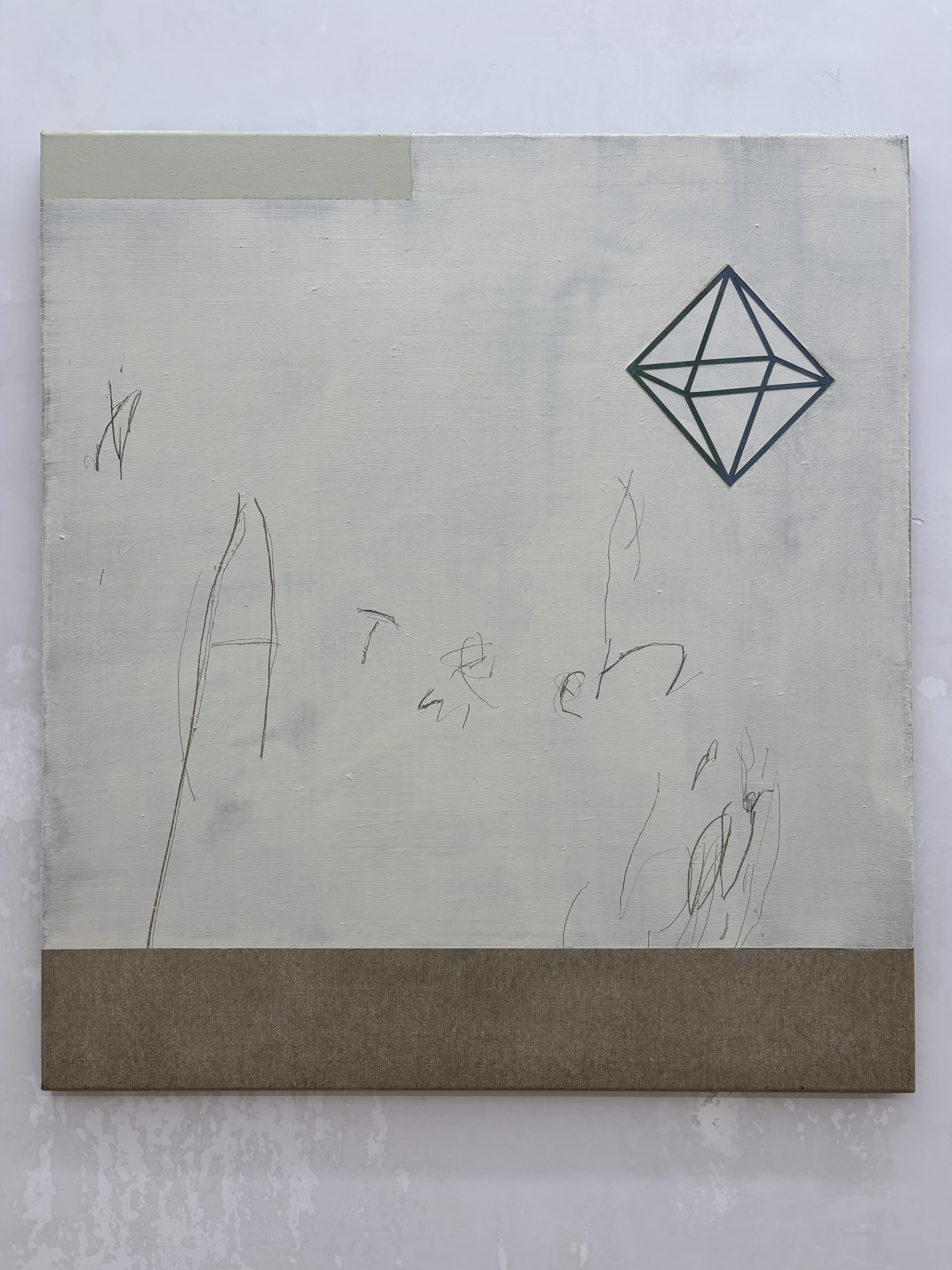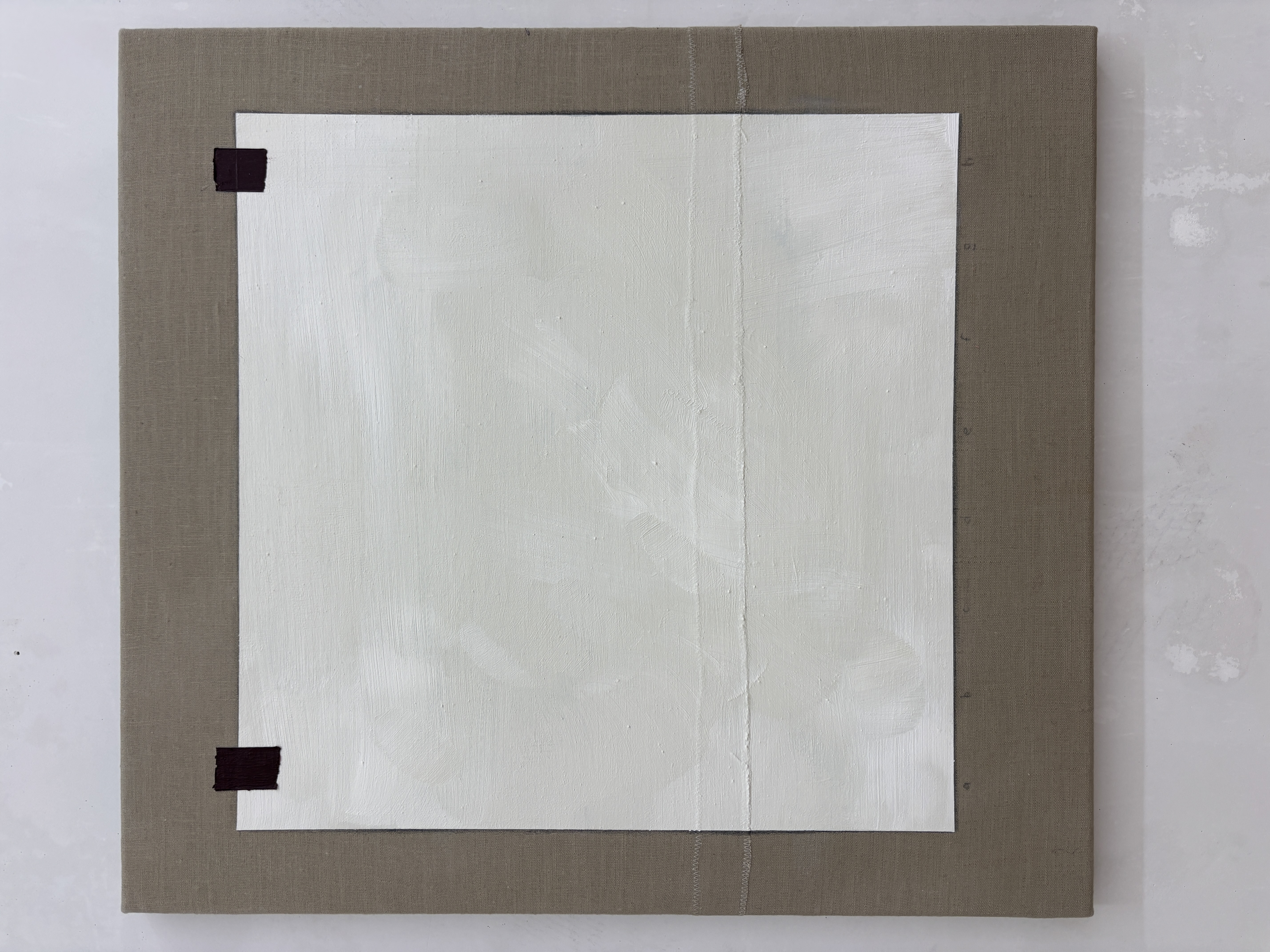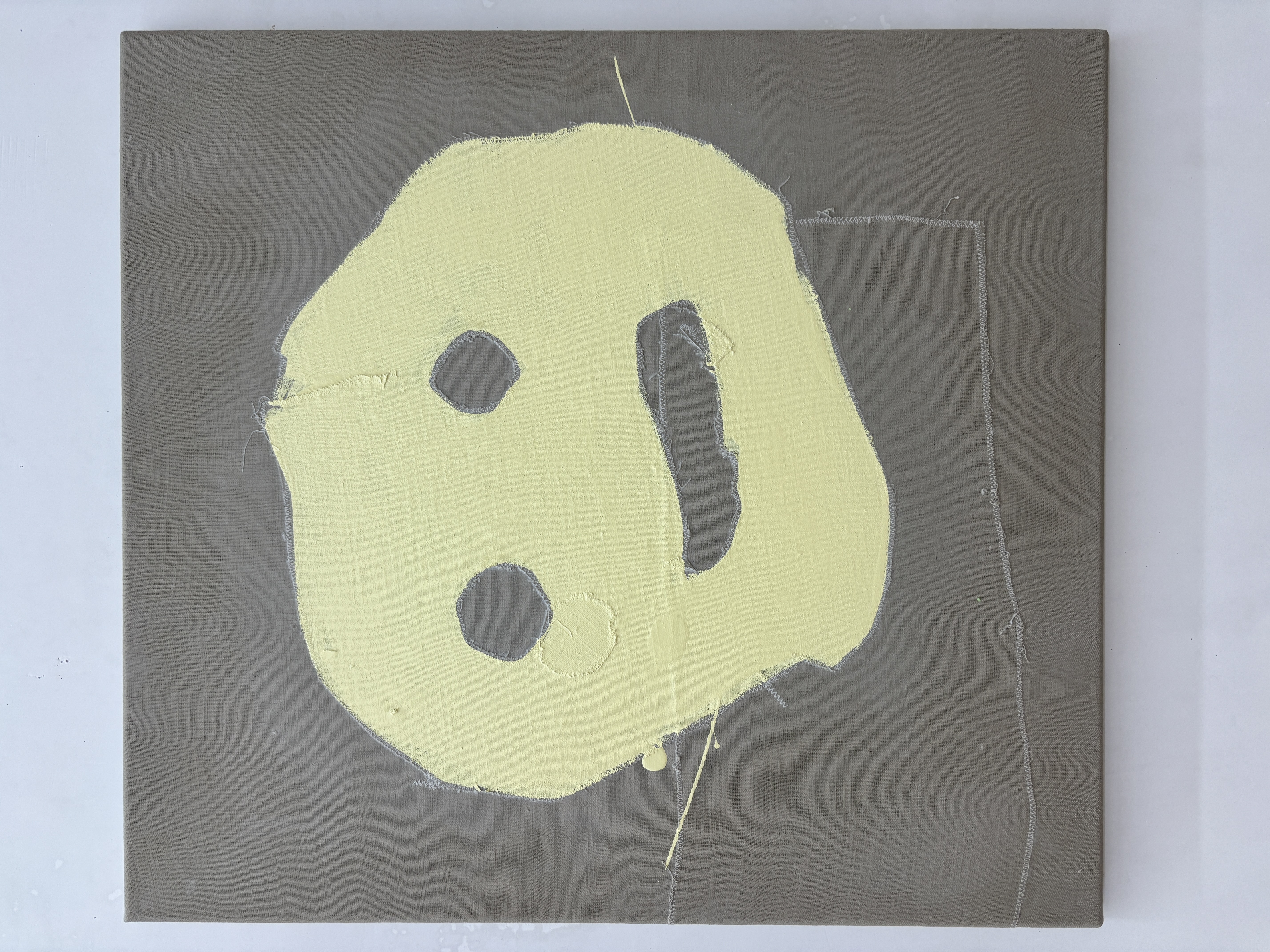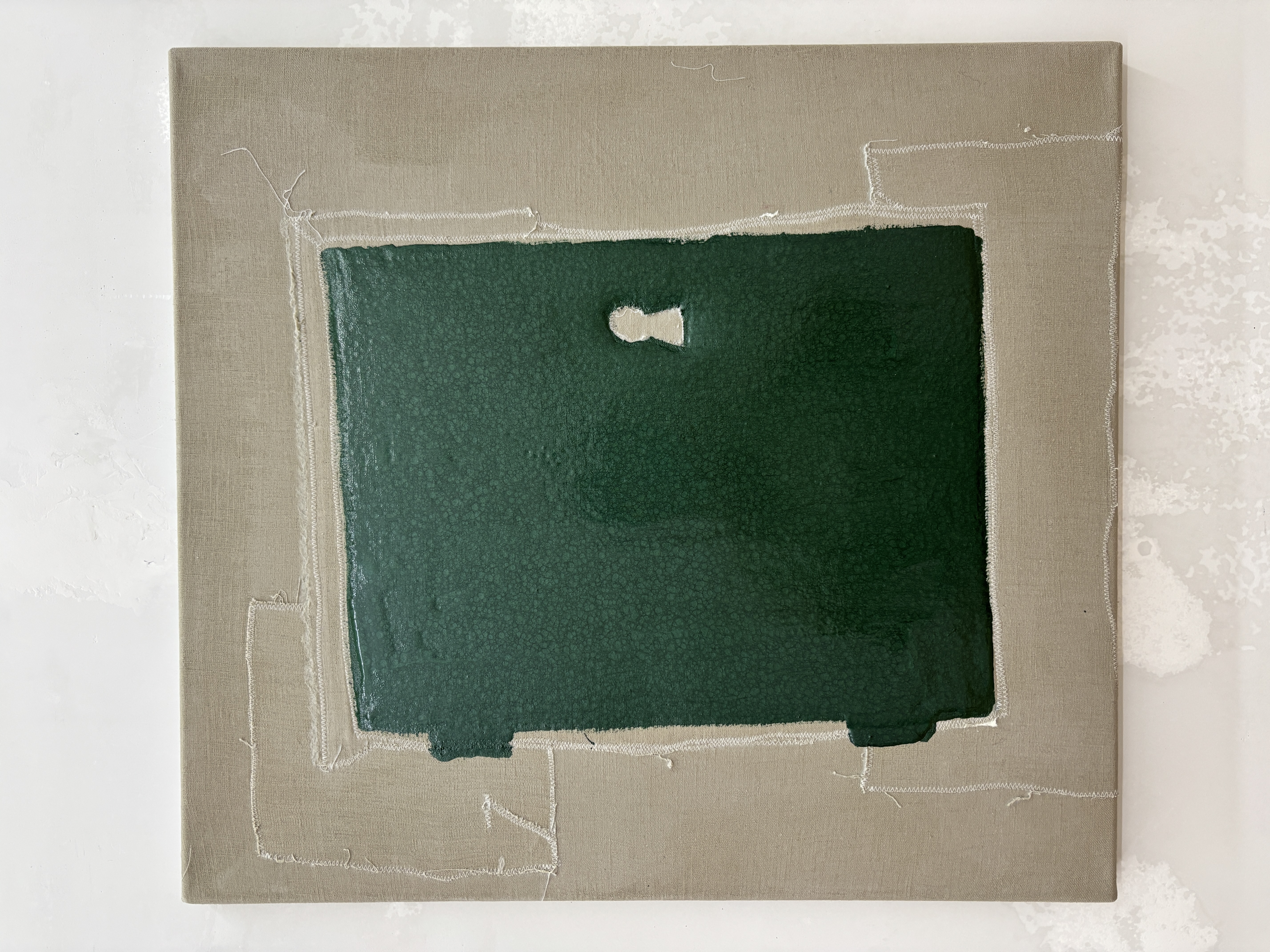 Leinwände operieren hier an der Schwelle zur Skulptur. Auf den zusammengenähten Flächen erscheinen Spuren von Tape, Papier oder Farbe, die andere Materialien – Stahl, Karton, Textil – evozieren oder nur andeuten. Eine Maske scheint metallisch, birgt jedoch Leere; statt Tiefe öffnet sich die blanke Leinwand. Ein schwarzes Monochrom auf roher Fläche wird – dem Titel nach – zur Landschaft. Diese Werke entfalten sich im Zwischenraum von Materialität und Imagination, von Präsenz und Leere – hier spricht die Abwesenheit ebenso deutlich wie das Sichtbare.
