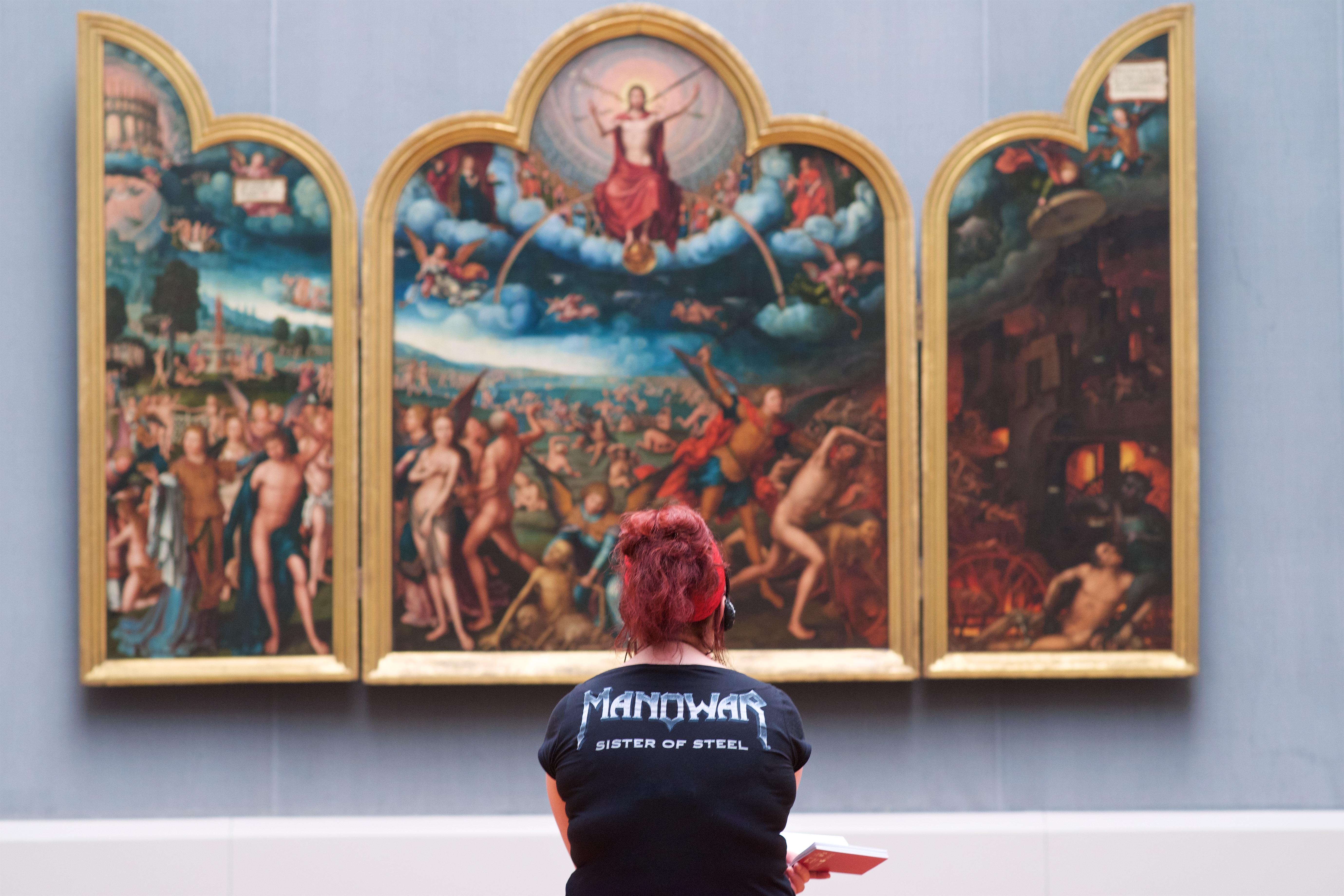 Über die Jahre, in denen Stefan Draschan als Jäger und Sammler mit der Kamera über die Flure flanierte, ist die durch pure Anzahl an Fotografien wie auch durch die Schärfe von Draschans Blick, sein Gespür für den richtigen Moment entstandene Werkreihe„People Matching Artworks“ entstanden. Der Fotograf ist sowas wie der Grzimek derKunstfotografie. Lag der Tierfotograf mit der Kamera bewaffnet in der Savanne, auf den einen richtigen Moment wartend, an dem die Gazelle am Wasserloch vom Löwen gerissen wird, um genau dann abzudrücken und zu knipsen, wartet Draschan vor den Caravaggios und Picassos auf Beute. Die Dame im roten Kleid etwa, die er bereits eine halbe Stunde vorher in der Lobby gesichtet hat.